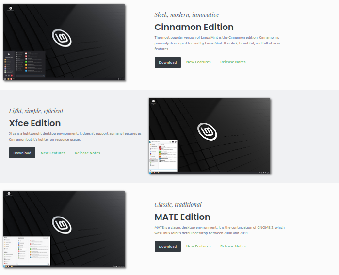 Cette partie est relativement simple. Il suffit de chercher « télécharger image iso linux X » sur votre moteur de recherche préféré. Une petite difficulté se présente toutefois. La plupart des distributions peuvent se présenter sous différentes moutures (flavors en anglais). Par exemple Mint en propose trois :